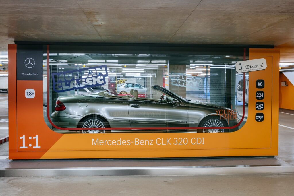 In the indoor exhibition, the cars are divided into different colorful themed areas, representative of the character of the cars on display. The “Easy Life” theme features two convertibles, a comfortable and luxurious CLK 320 CDI (1998) and a more sporty SLK 230 with a supercharger. It should be noted that this SLK brought back the coupe-convertible configuration with a hardtop. In the “Refinement” category, there are two “high-end” models: a CL 600 (1999), a large 4-seater coupe equipped with a V12 engine, and a CLS 350 (2006), a model that introduced a new style of 4-door coupe bodywork, which was subsequently adopted by many other manufacturers.